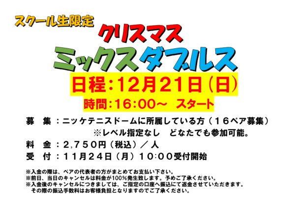 イベント&新着情報 2025.12.21 スクール生限定 クリスマスミックスダブルス 募集要項 2025年11月17日 « 2026.11.16 アベレージカップ 結果 フロントスタッフ、コーチングスタッフ募集中‼ »
