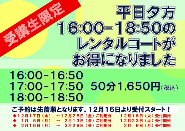 イベント&新着情報 平日夕方のレンタルコートパック開始しました! 2025年12月18日 レンタルコートをお得にご利用いただける時間帯をご用意しました。 お子様と保護者様でお子様のレッスン前後にいかがですか? ご予約は先着順となっておりますので、お申し込みはお早めに。。。 « イベント予定表 再度2026年1月変更しました!